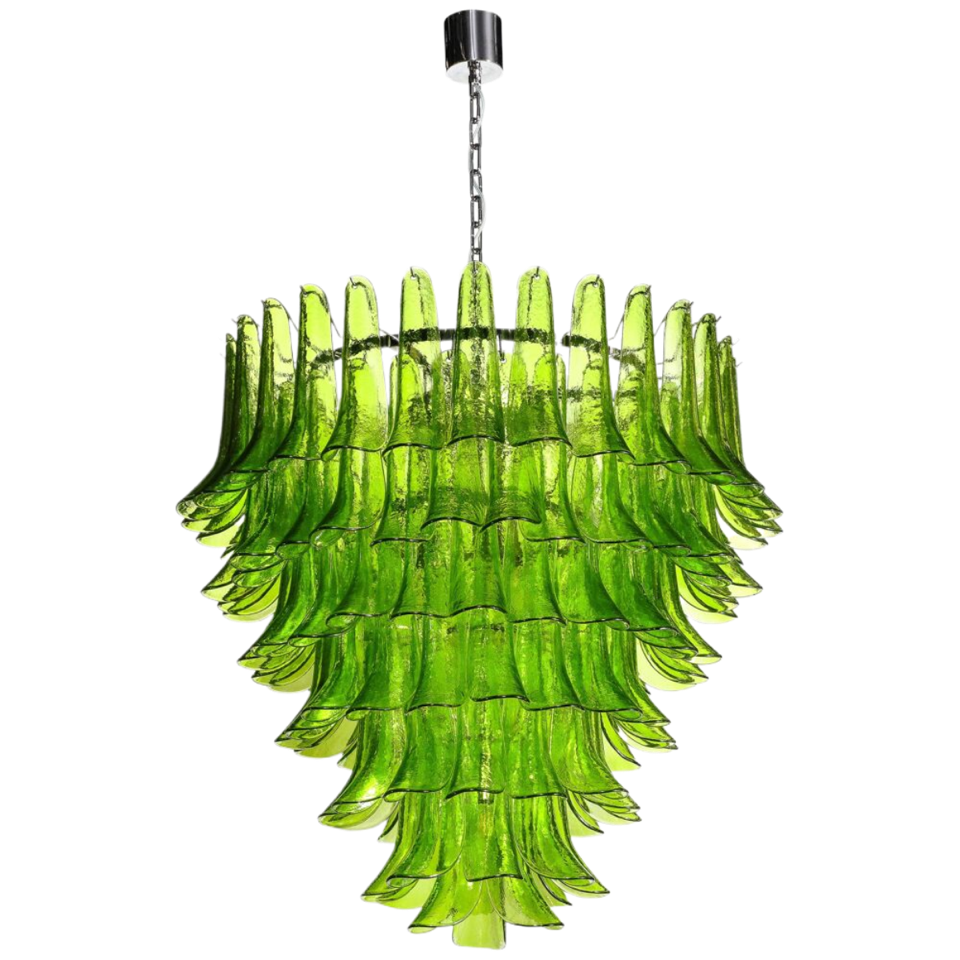 LUSTRE EM VIDRO MURANO VERDE COM PEÇAS SOBREPOSTAS E FEITO DE DES LUMB RANTES Q UE PENAS. CRIAM É UM UMA IMPRESSIONAN
