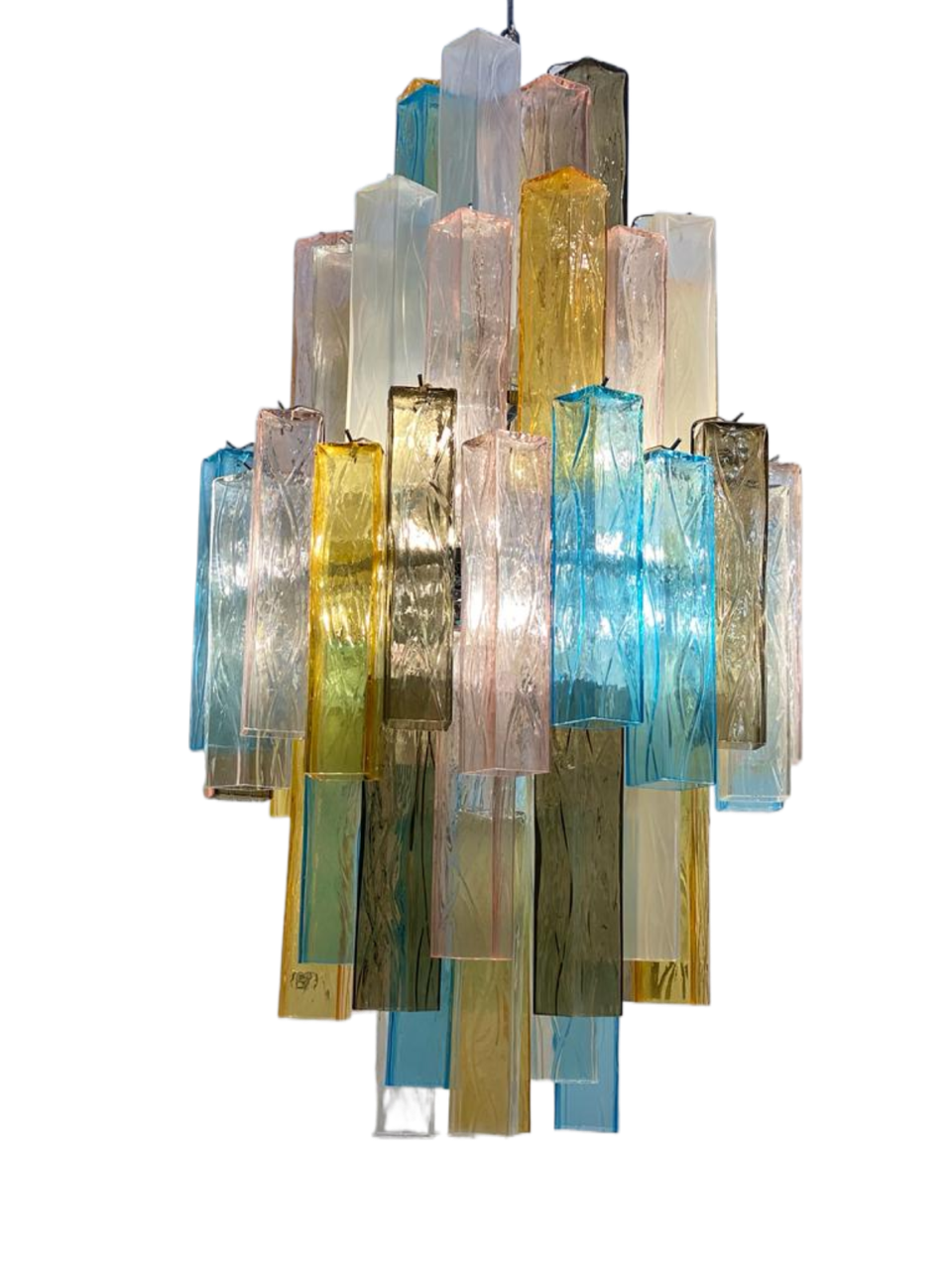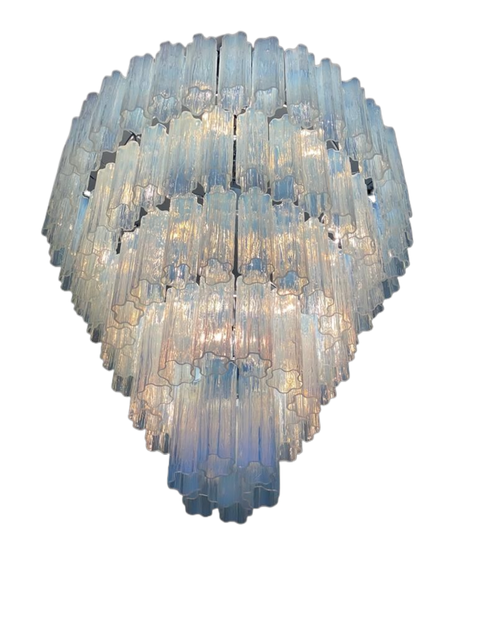 LUSTRE CONTEMPORÂNEO E ELEGANTE COM UMA COR OPALINA RARA NOS ELEMENTOS DE VIDRO DE MURANO. SÃO 5 NÍVEIS COM 104 ELEMENTOS EM