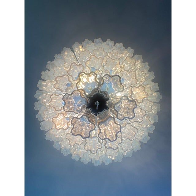 LUSTRE CONTEMPORÂNEO E ELEGANTE COM UMA COR OPALINA RARA NOS ELEMENTOS DE VIDRO DE MURANO. SÃO 5 NÍVEIS COM 104 ELEMENTOS EM VIDRO COM UM FORMATO ESPECIAL E 12 LÂMPADAS INSERIDAS.